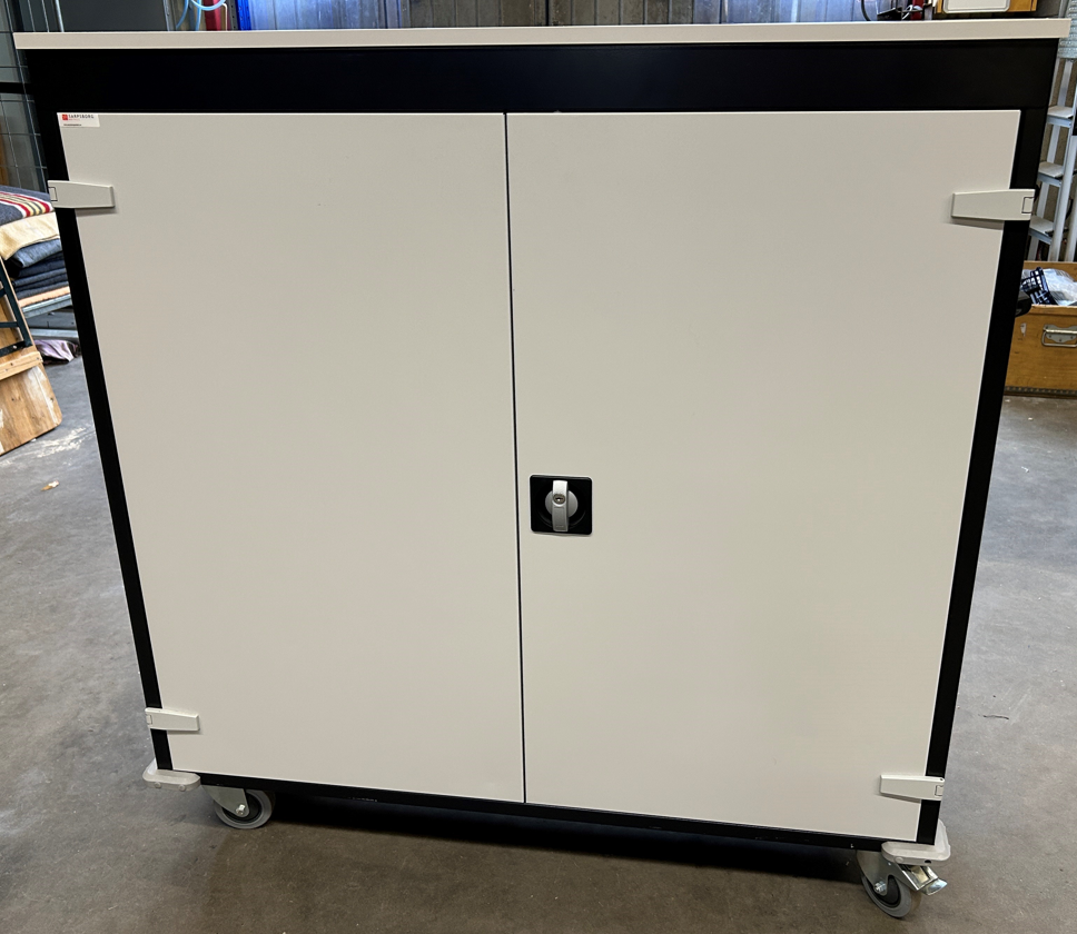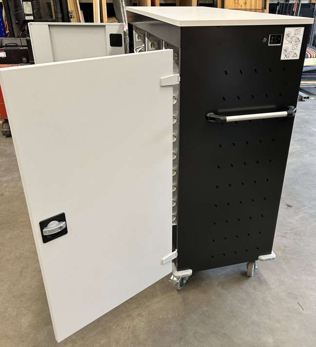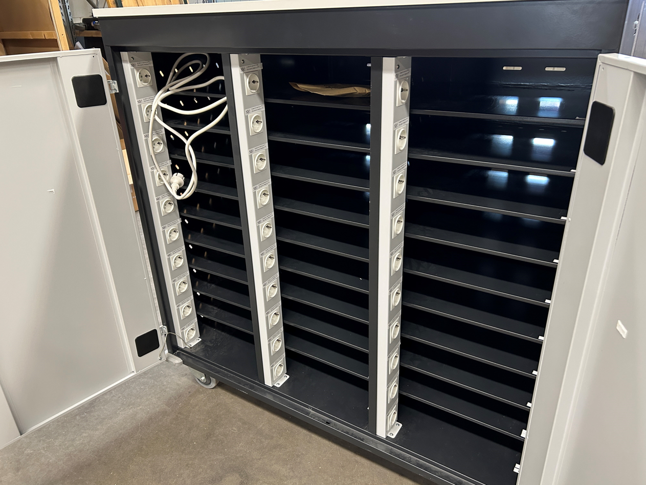 Mobilt laddskåp för förvaring och laddning av laptops, surfplattor och mobiltelefoner. Detta är en PC-vagn med en solid konstruktion, med två låsbara dörrar med ett solitt cylinderlås, stora lättrullande hjul med låsning och praktisk handtag för enkel hantering av vagnen. Varje fack har ett eget strömuttag. Tillkoppling till elnätet sker med en gemensam tillkoppling med en egen 16A säkring och överspänningsskydd. I tillägg har detta PC-vagnen sekvensiell strömstyring till varje fack, så att inte alla laddstationer startar samtidigt. Detta för en god elsäkerhet.